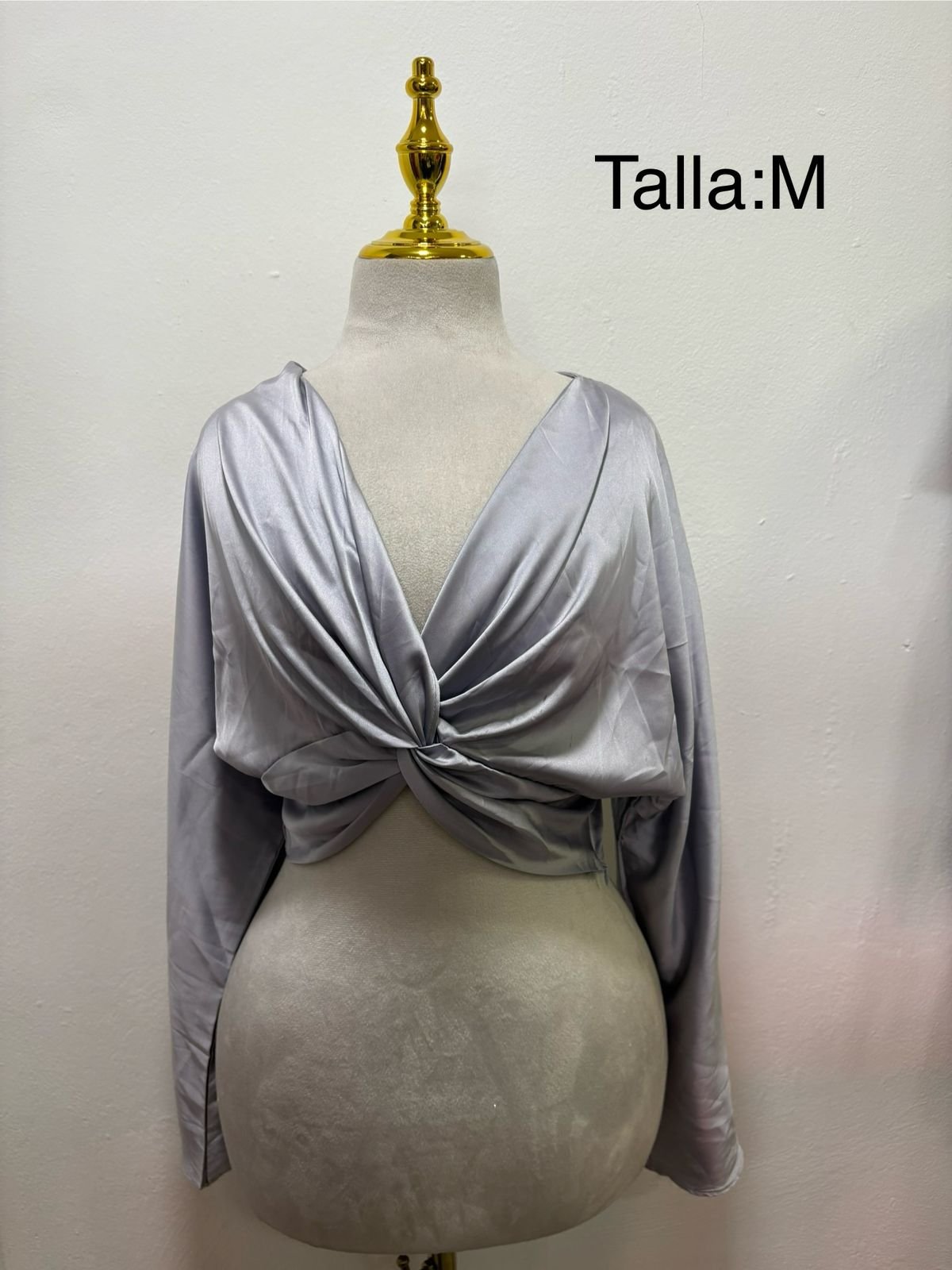 Blusa de dama color plateado con diseño cruzado al frente y escote en V. Elegante, moderna y perfecta para ocasiones especiales o salidas nocturnas.