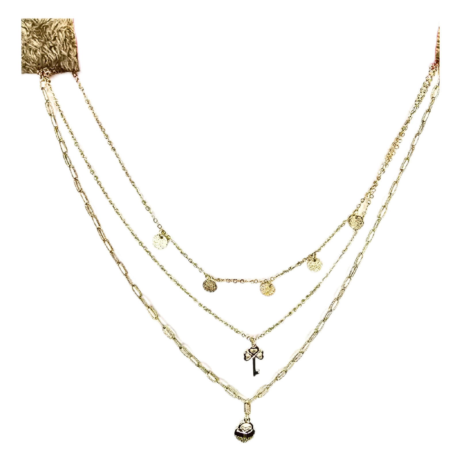 Cadena triple de acero inoxidable con delicados dijes y candado decorativo. Diseño elegante y moderno, ideal para complementar cualquier outfit.
