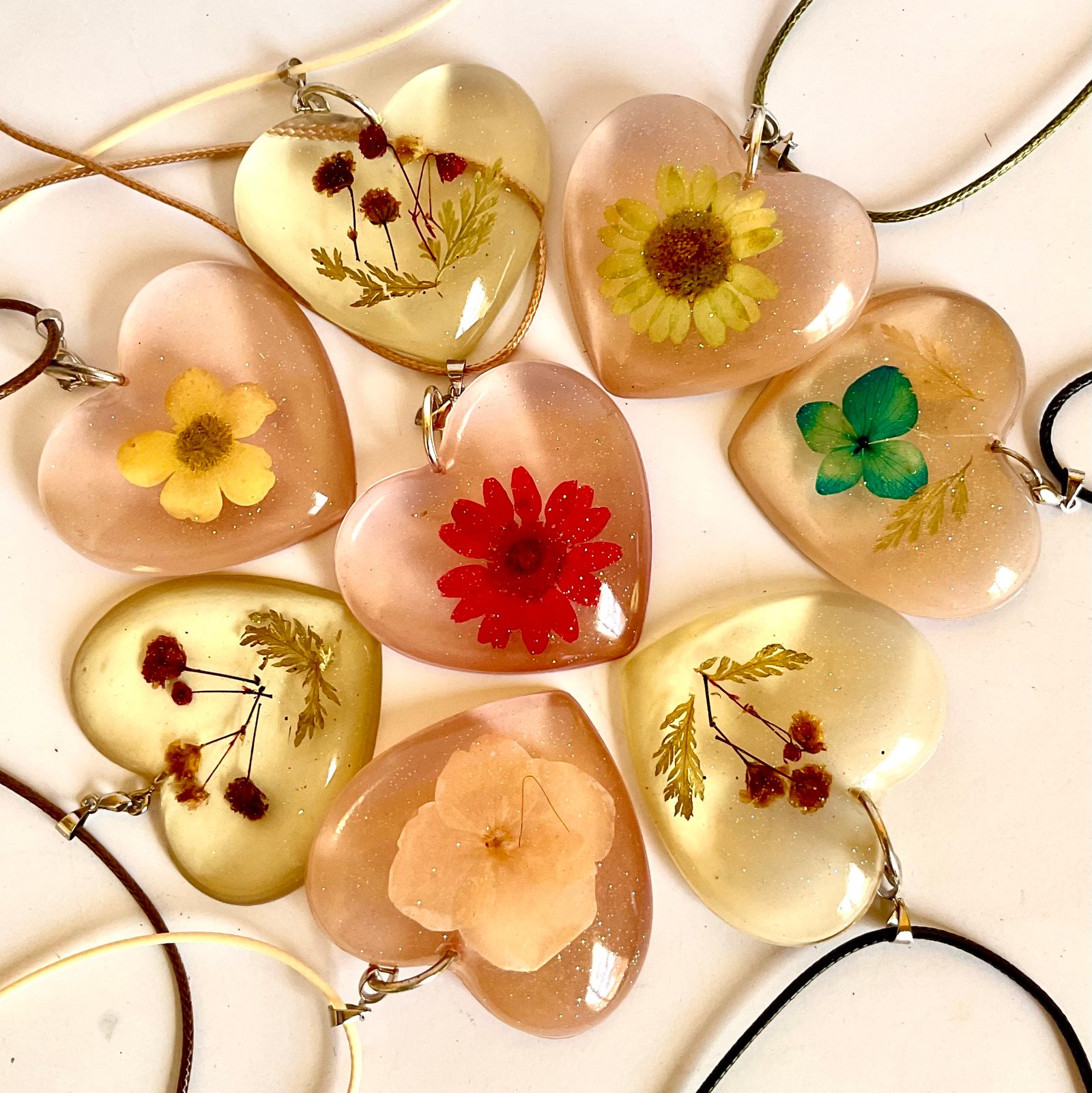 Descubri nuestros collares de corazón en resina con flores, donde cada pétalo queda inmortalizando en una pieza única.