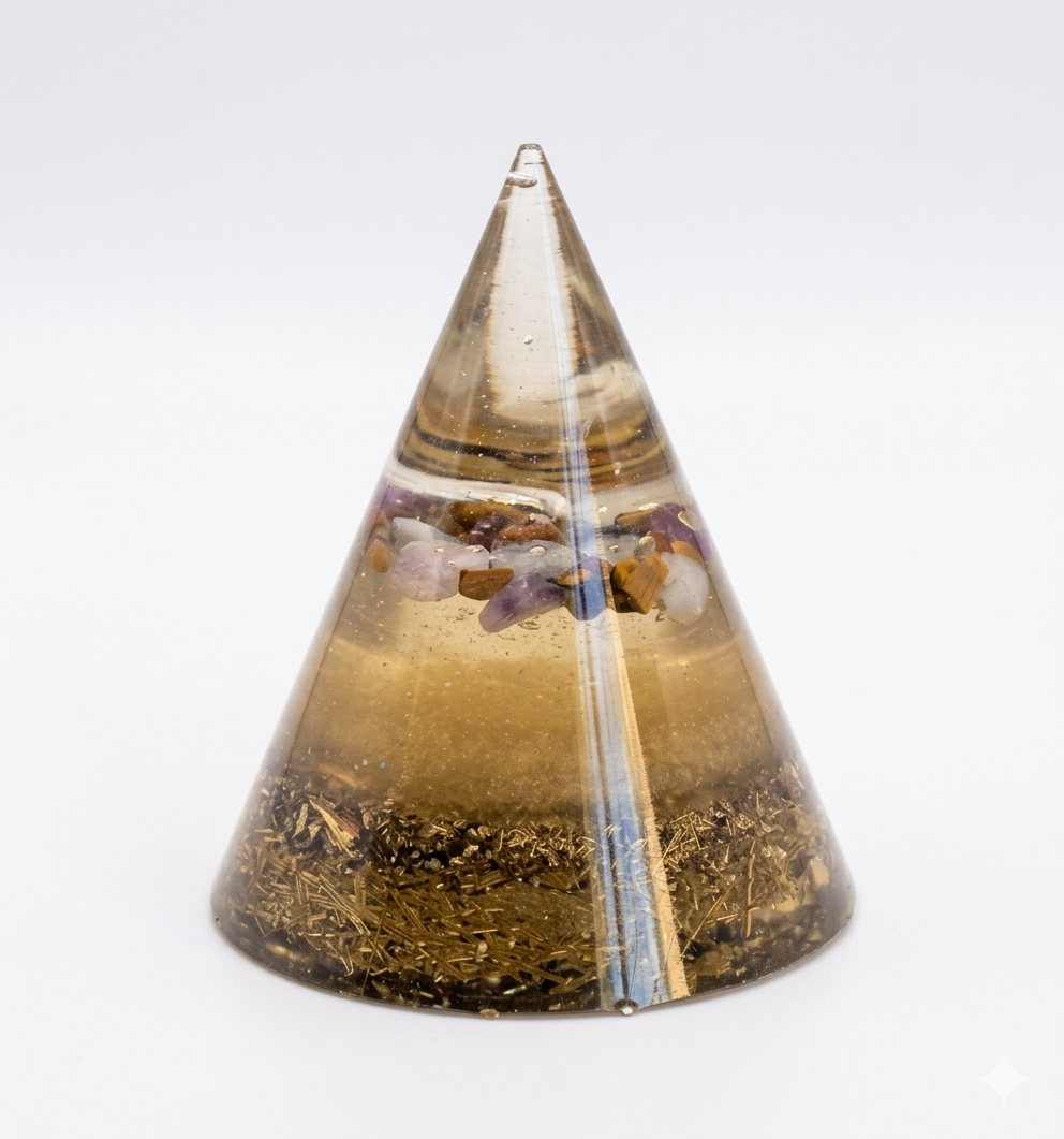 Esta orgonita en forma de cono es una fusión perfecta entre sabiduría espiritual, equilibrio emocional y fuerza interior.Su energía fluye desde lo más profundo hacia el universo, ayudándote a mantener centrado/a, protegido/a y en paz.