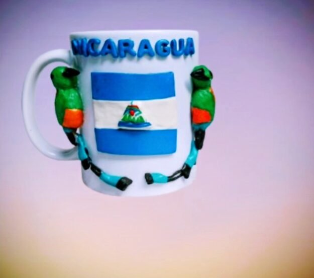 Taza elaborada a mano con arcilla polimerica con bandera de Nicaragua y el pájaro nacional guardabarranco